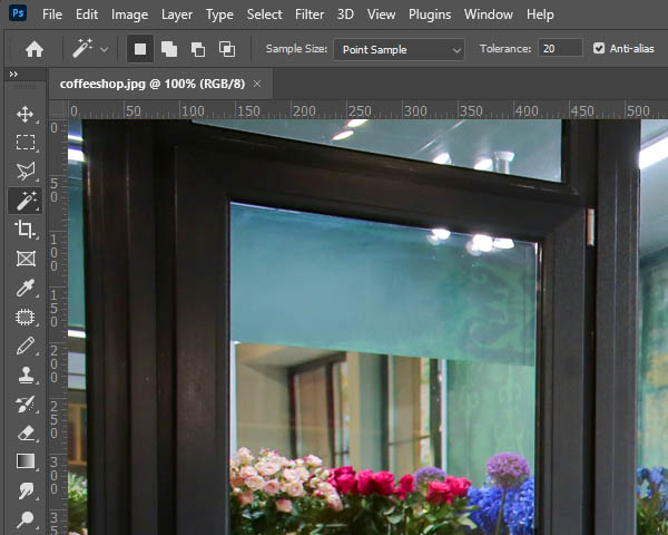 Let’s assume that there’s a photo of a florist’s boutique that we want to put up on a website. When loaded into Photoshop, this image might look something like this: